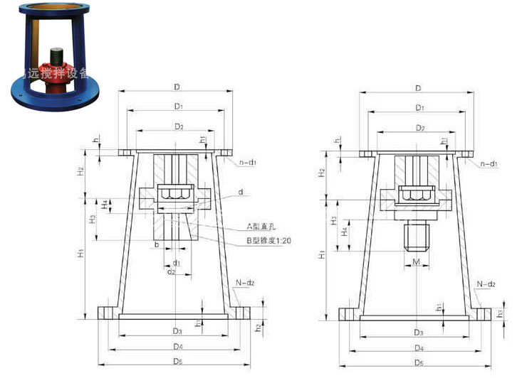 本機架適用于擺線針輪減速機的聯(lián)接,配剛性聯(lián)軸器,上聯(lián)軸器裝JA型直孔,下聯(lián)軸器裝A型直孔或B型錐孔,錐度為1:20的聯(lián)軸器。該機架無支承適用于反應器傳來的軸向力不大時使用。