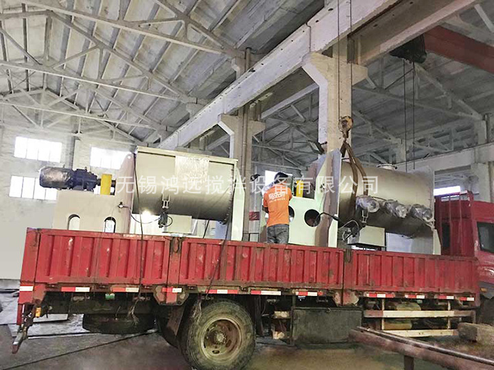 臥式螺帶混合機由安裝于攪拌軸上的內(nèi)外徑螺條帶動桶體內(nèi)物料,使攪拌器在桶體內(nèi)大范圍翻動物料。攪拌器結(jié)構(gòu)上,螺條設(shè)計成內(nèi)外、左右互為反螺條,攪拌器工作時內(nèi)螺條帶動靠近軸心處物料做軸心旋轉(zhuǎn),軸向由內(nèi)至兩側(cè)推動,外螺條帶動靠近桶壁物料做軸心旋轉(zhuǎn),軸向由兩側(cè)至內(nèi)推動,于是造成物料在桶體內(nèi)對流循環(huán)、剪切滲混,完成物料在較短時間內(nèi)快速均勻混合。